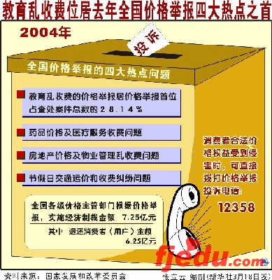 国家发改委称, 2006 年,全国共受理价格举报咨询 55.9 万件,查处价格举报违法案件 5.1 万件,退还消费者1.9亿元,上缴财政 1.1 亿元。统计数据显示,教育乱收费、交通运输、医药、房地产及物业管理、电信位居查处举报案件的前五位,合计约3.4万件,占案件总数的 66 %。