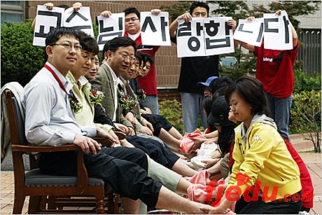 人民网4月4日报道 4月3日上午11时,位于首尔西大门区的韩国明知大学的大讲堂里,出现了令人感动场面:68岁的大学校长郑根谟率领55名教授用脸盆接水为即将走向社会的3500名学生举行洗脚仪式,以表达对学生的关爱和祝福,增进师生情谊。举行这种活动的宗旨在于希望即将踏入竞争社会的弟子们能够勇敢面对一切。