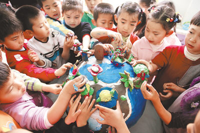 4月21日,孩子们用自己制作的泥塑“花、鸟、树木”等装扮“地球”。当日,济南市解放路第一小学幼儿园泥塑班的孩子们在教师指导下,开展名为“我爱地球‘妈妈’”的主题泥塑制作活动,迎接4月22日“世界地球日”的到来。吕传泉摄(新华社发)