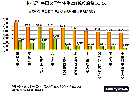 在中国211重点院校中,清华大学一枝独秀,清华毕业生以平均月薪5565元毫无争议夺得榜首。复旦大学以4981元,交通大学4948元分别名列二、三位,两者之间差别甚微。