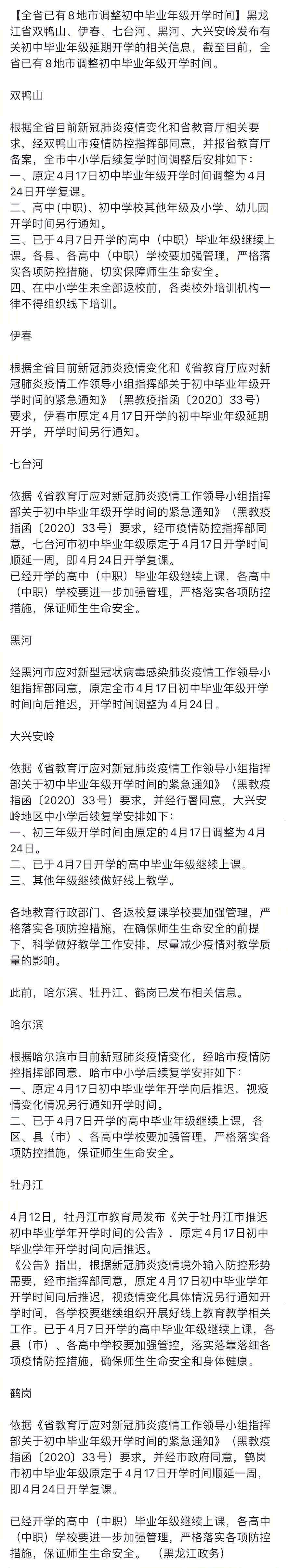 【转发周知!#黑龙江多地再次延期开学#】今日,据@黑龙江发布 消息,黑龙江双鸭山、伊春、七台河、黑河、大兴安岭发布有关初中毕业年级延期开学的相关信息,加上此前已发布延期开学信息的哈尔滨、牡丹江、鹤岗,截至目前,黑龙江全省已有8地市调整初中毕业年级开学时间。