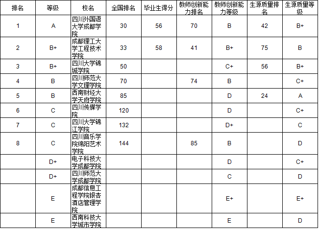 由中国管理科学研究院武书连主编,中国统计出版社出版的《挑大学 选专业--2014高考志愿填报指南(独立学院版)》,已于2014年2月发行。《挑大学 选专业--2014高考志愿填报指南(独立学院版)》,以全国独立学院综合实力排名、学科门类排名为主线,以教师创新能力、教师绩效、新生质量、本科毕业生质量排名为辅线,对中国322所独立学院(其中31所已转设为普通高校)的基本情况作了全面介绍,为考生及考生家长报考独立学院提供了重要的参考信息。以下为西南地区各省独立学院本科毕业生质量排行榜。