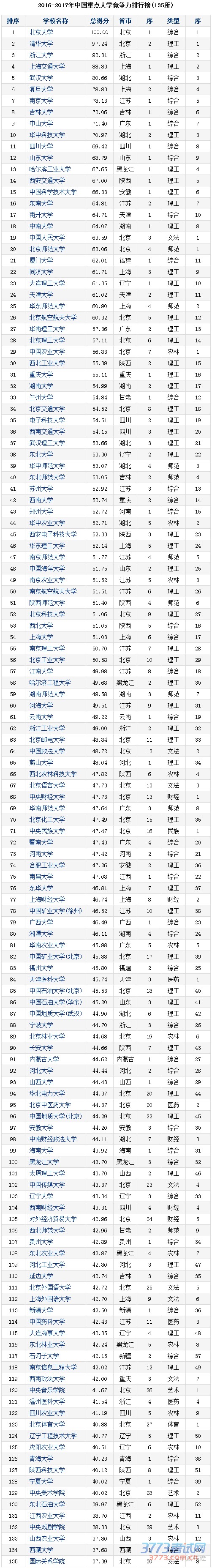 近日,中国科学评价研究中心、武汉大学中国教育质量评价中心联合中国科教评价网推出《2016年中国大学及学科专业评价报告》。报告发布了135所中国重点大学竞争力排行榜,详细排名如下。