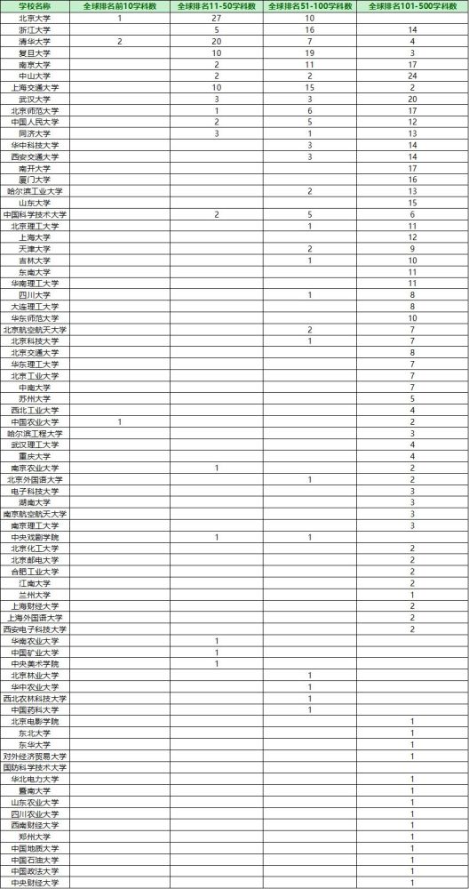 2016年,“双一流”高校建设正式启动,发展3年之后,各大高校的学科建设也有了全新的发展。和“双一流”高校建设启动年相比,有学科进入世界前50的大学数量增加了257%,从7所增加到18所。其中,北京大学28个学科进入世界50强,清华大学22个,复旦大学和上海交通大学各10个,浙江大学5个,武汉大学和同济大学3个,南京大学、中国人民大学、中山大学、中国科学技术大学各2个,北京师范大学、中国农业大学、华南农业大学、南京农业大学、中国矿业大学、中央美术学院、中央戏剧学院各一个。