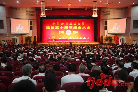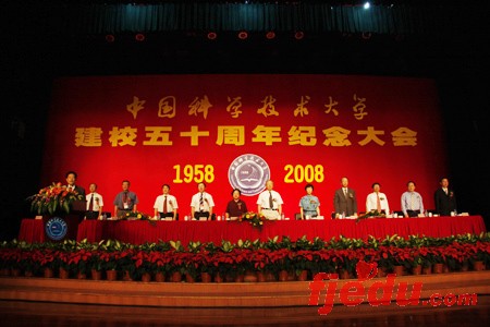 9月20日上午,中国科大建校50周年纪念大会在学校大礼堂隆重举行。中共中央政治局委员、国务委员刘延东发来了贺信。全国人大常委会副委员长、中科院院长路甬祥出席会议并发表重要讲话。全国政协副主席、九三学社中央副主席、科大校友王志珍院士,九届全国人大常委会副委员长、中国红十字会会长、我校原党委书记彭珮云,教育部副部长章新胜,科技部副部长曹健林,中共安徽省委常委、合肥市委书记孙金龙,中共安徽省委常委、省委组织部部长段敦厚,清华大学校长顾秉林院士,中国科协副主席、科大校友赵忠贤院士,中国邮政集团公司副总经理刘明光,中国科大校长朱清时院士等领导在主席台就坐。校领导许武、侯建国、李国栋、王东进、鹿明、窦贤康、叶向东,秘书长朱灿平,校长助理尹登泽、张淑林,海内外有关大学校长以及一千多名来自国内外的校友、社会各界朋友参加了大会。会议由中国科学院党组成员、中国科大党委书记郭传杰主持。