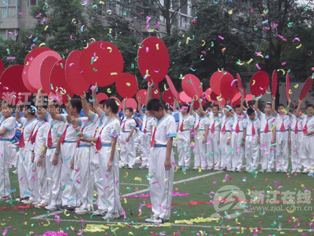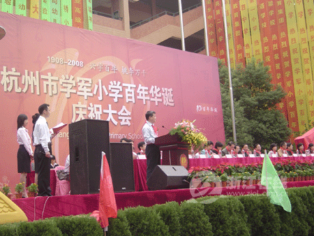 浙江在线?教育频道杭州10月5日讯(记者汪群芳文/摄)几经变迁,几易其名,历经沧桑,风雨百年,桃李万千。今天,学军中学求智校区彩旗飘扬,一片欢腾,来自海内外的校友、退休教师、在校师生以及浙江省政协主席周国富、浙江省教育厅厅长刘希平、共青团浙江省委书记鲁俊等省市各界领导共享“学军百年华诞”。