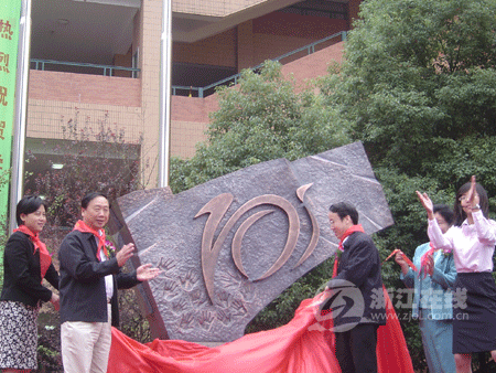 庆典仪式上,浙江省教育厅厅长刘希平、杭州市教育局副局长沈建平、西湖区教育局局长吴吉春等领导与设计者沈洋同学一起为校庆纪念雕塑揭幕。