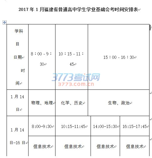 2017年1月福建省普通高中学生学业基础会考时间安排表