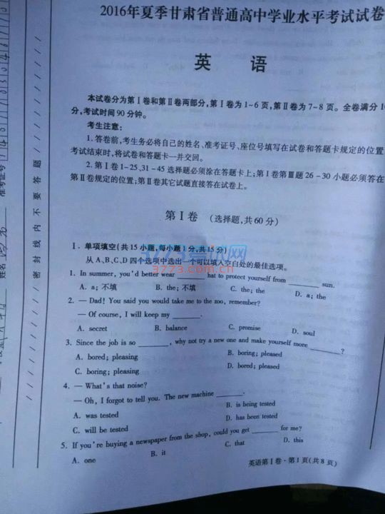 今天15:00,英语科目考试开考,考试时间1个半小时。“甘肃考神@邵大大”在14:59发指令,“速度拍题给我”。网友“默言学长”则在14:56分发出八张疑似考卷照片,照片上写着“2016年夏季甘肃省普通高中学业水平考试试卷”。