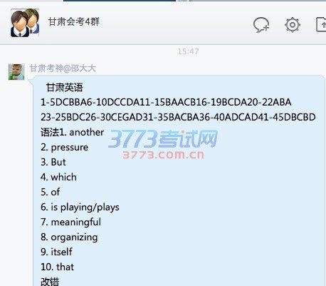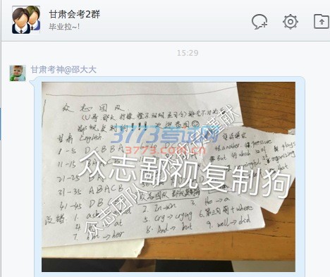 “甘肃考神@邵大大”在QQ空间发布疑似英语考试的答案后,很快也在多个QQ群里传播。 [保存到相册] |