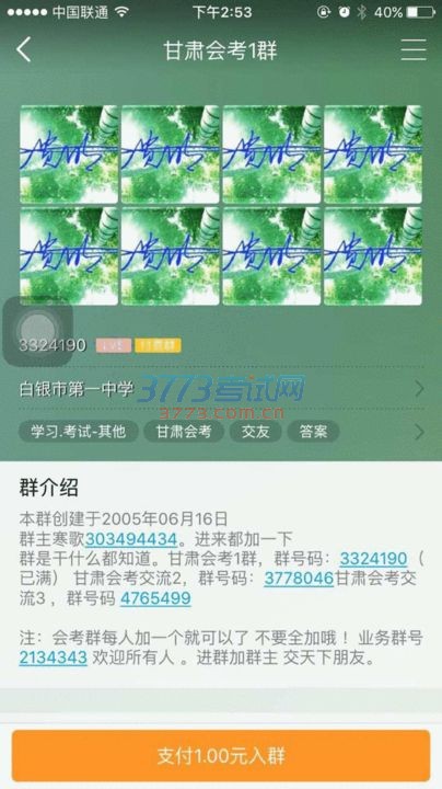 名为“甘肃省会考1群”(群号:3324190)的QQ群的资料显示,想要进入该群,需“支付1元”。 |