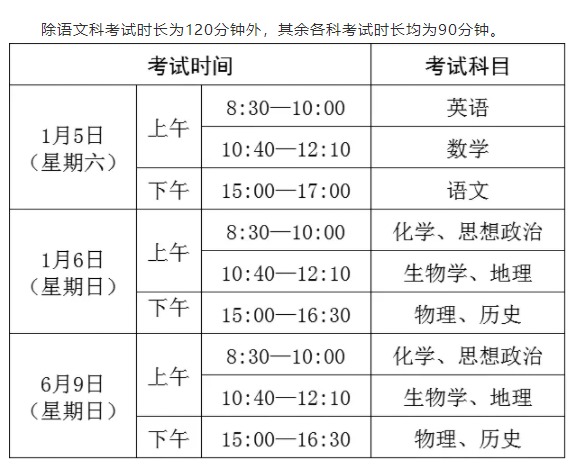1月考试科目为语文、数学、英语、思想政治、历史、地理、物理、化学和生物学等9科,6月考试科目为思想政治、历史、地理、物理、化学和生物学等6科。