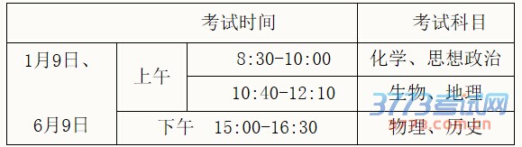 2016年普通高中学业水平考试(以下简称学考)时间分别是1月9日(星期六)和6月9日(星期四)。考试科目为思想政治、历史、地理、物理、化学和生物等6科,各科考试时长为90分钟。具体安排如下: