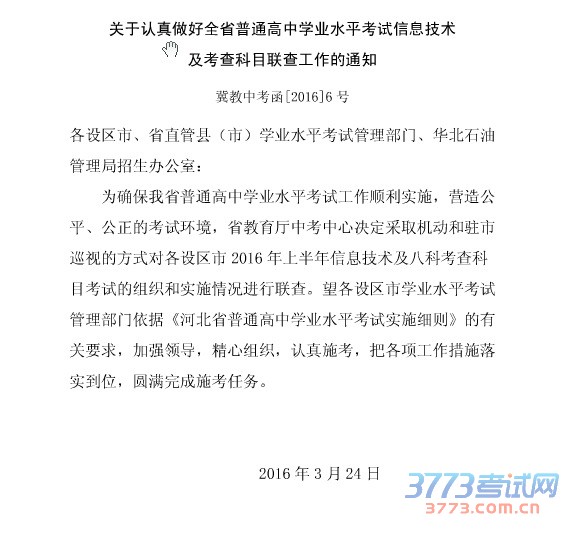 2016河北高中学业水平考试考查科目考查工作通知