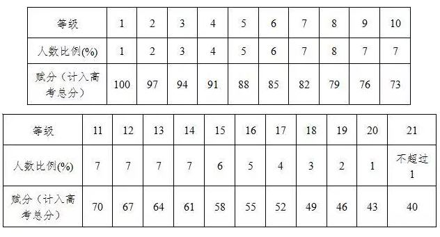 对物、化、生、政、史、地、技术7门课来说,学考和选考都以当次当科考试考生的卷面得分(学考按满分70分的得分,选考按满分100分的得分)为依据,根据事先公布的等级比例(见附录),按最接近的累计比例划定等级。学考划ABCDE 5级;高考选考划21级划定,并按对应关系赋分,在招生录取时计入高考总分。