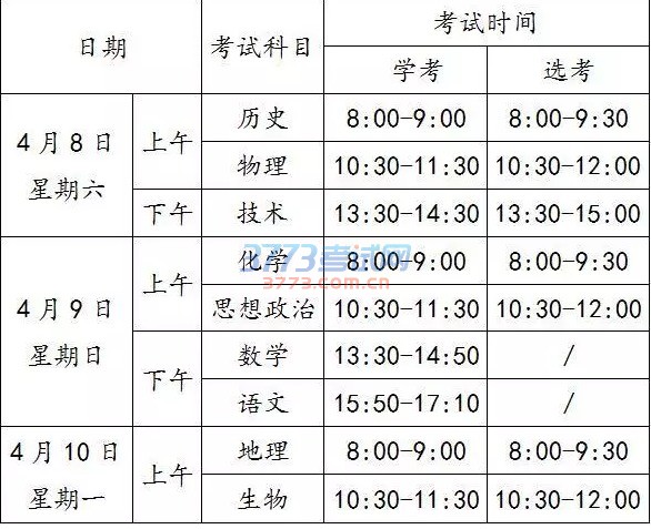 新高考实行高中学考和高考选考相结合,考试成绩既用于评价学业水平,又用于高考招生。本次考试中,除语文、数学仅提供学考试卷,政治、历史、地理、物理、化学、生物及技术各科均提供学考、选考两种试卷,共有16套试卷。安排9个场次的考试,历时两天半,具体时间见下表。