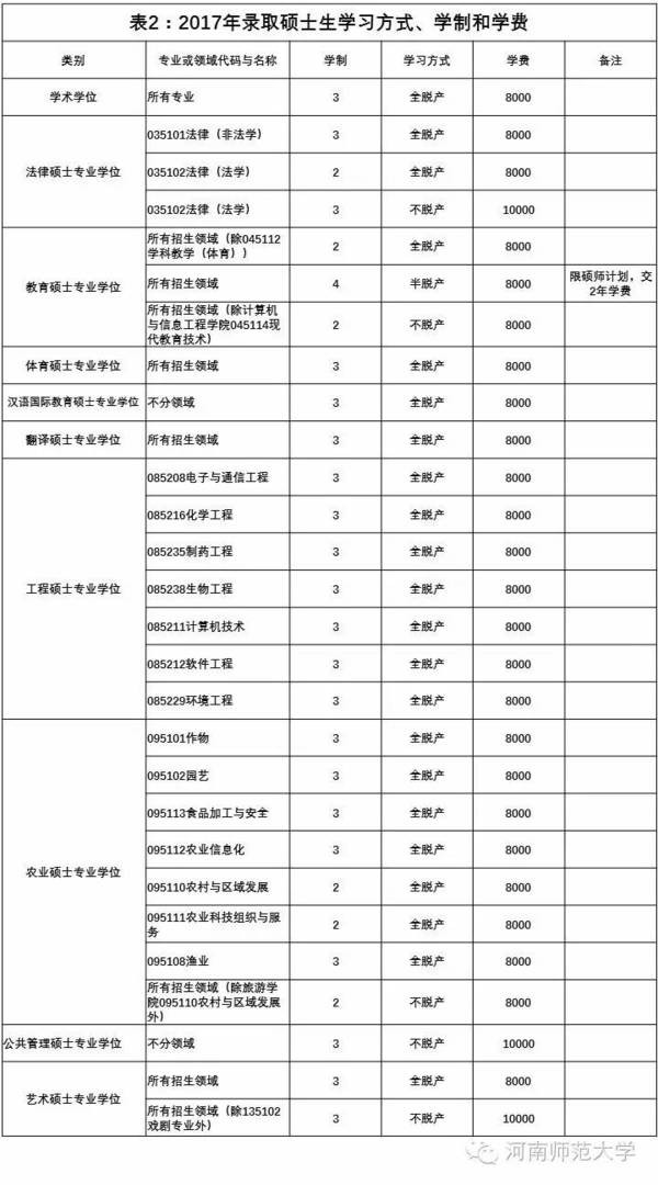 学术学位全部为全日制脱产学习,学制3年。专业学位有三种学习方式,其中硕师计划录取的研究生学习方式为半脱产,即前3年利用暑假完成课程学习,第4年脱产完成学位论文写作和答辩,其他专业学位有全日制全脱产学习,学制2年或3年,和非全日制不脱产学习,学制2年或3年。根据国家和河南省有关规定,经研究我校2017年录取的研究生,学术学位学费每年8000元,专业学位学费根据专业学位类别和学习方式的不同为每年8000元或10000元,详见表2。