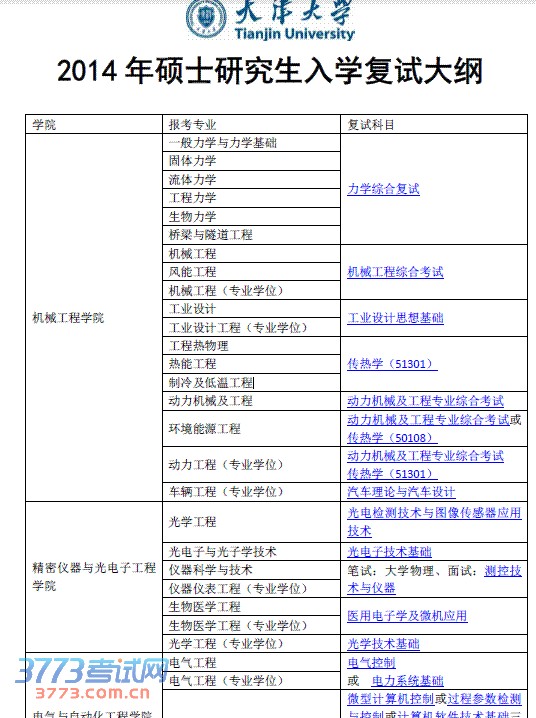 天津大学公布2014年硕士研究生入学复试科目考试大纲