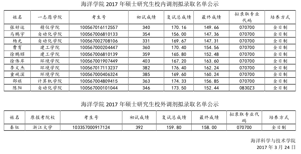 2017天津大学海洋学院考研拟录取名单