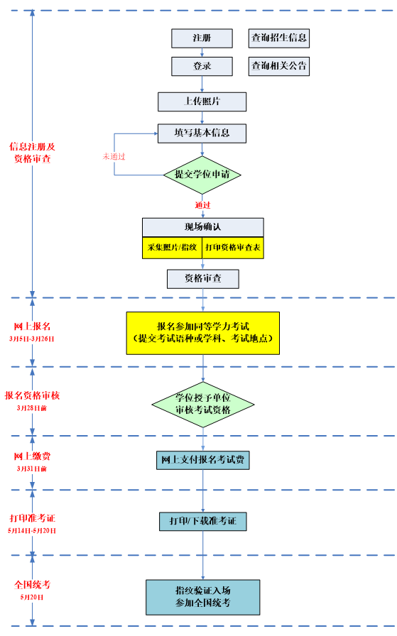 四、网上报名时间:2018年3月5日-3月26日,逾期不予受理。在报名期间,申请人登录信息平台,提交申请参加考试的语种或学科以及参加考试的地点,考生报名流程见附件1。申请人一般应在学位授予单位所在省市参加考试。如因特殊情况,需申请在工作单位所在省市参加考试的,必须经学位授予单位同意,方可完成报名并参加考试。