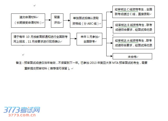 复旦大学旅游管理专业硕士(MTA)项目2014年将继续采取招生预审制度,即先参加面试,确定录取资格线,再参加全国联考。具体程序见下图。