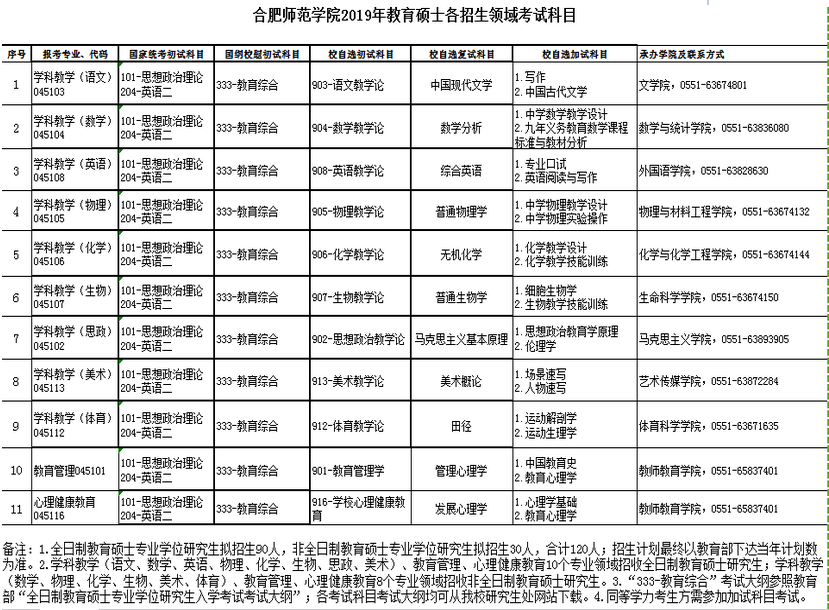 2019合肥师范学院教育考研各招生领域考试科目
