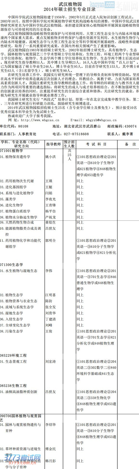 2014中科院武汉植物园硕士招生专业目录