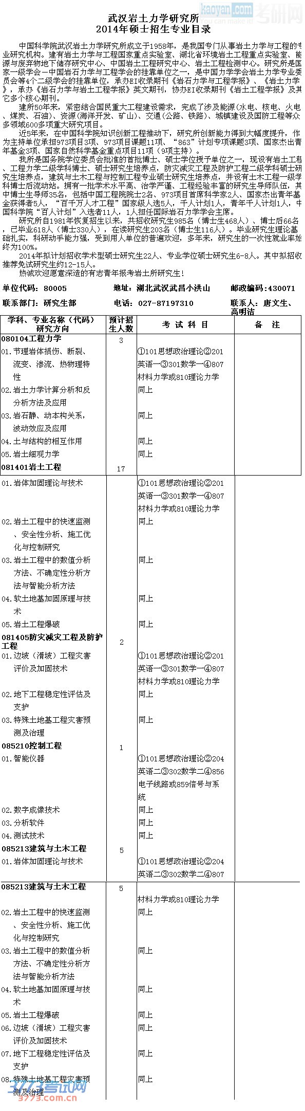 2014中科院武汉岩土力学研究所硕士招生目录