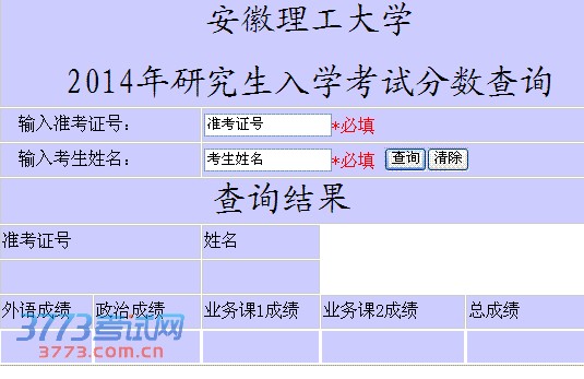2014年研究生入学考试分数查询 输入准考证号: *必填 输入考生姓名: *必填 查询结果 准考证号 姓名 外语成绩 政治成绩 业务课1成绩 业务课2成绩 总成绩