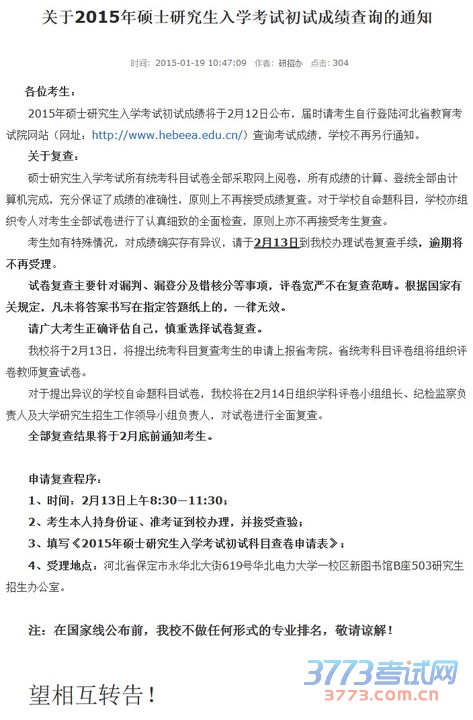 华北电力大学(保定)研究生院昨天早上10点发布通知,该校2015考研初试成绩将于212日公布,考生可以登录河北省教育考试院官方网站查询。成绩复查只能在213日当天来该校研招办办理,逾期不再受理。以下是通知截图: