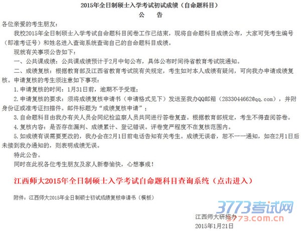1月21日,江西师范大学研究生招生网发布公告,该校2015考研初试自命题科目考试成绩公布。广大考生可凭准考证号和姓名进入查询系统查询专业课成绩。公共课成绩预计将于2月中旬公布。从即日起到31日,考生可声请复核,逾期不再办理。以下是通知截图。查看成绩和详情请登录该校研招网站。