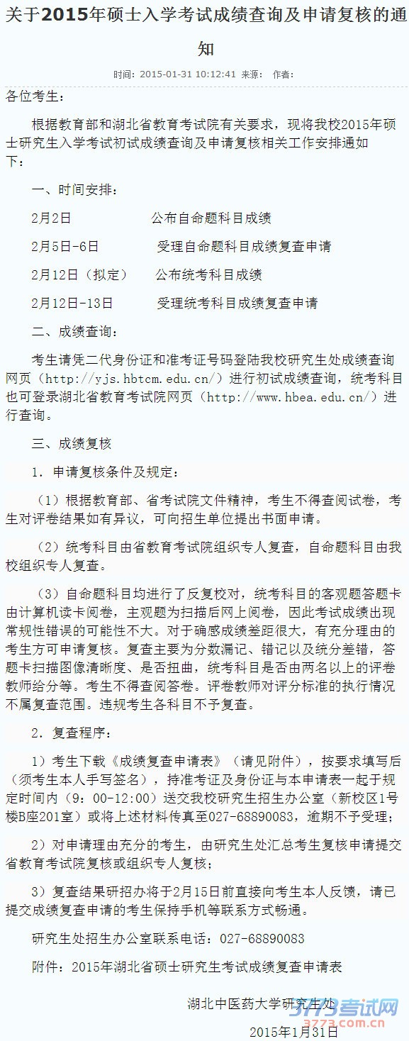 1月31日上午,湖北中医药大学研究生处官网发布《关于2015年硕士入学考试成绩查询及申请复核的通知》。根据上级统一安排,该校从2月2日起可查自命题科目考试成绩。初步拟定2月12日可查统考科目成绩。今天起,考生就可凭身份证号与准考证号登录研究生处查询系统。另外,考生也可登录湖北教育考试院网站查询统考科目成绩。