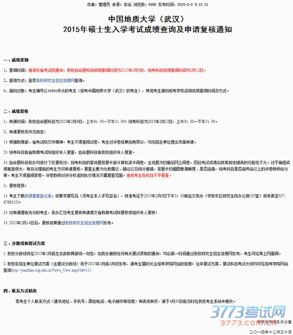 今天早上9点中国地质大学(武汉)研究生招生信息网发布《2015年硕士生入学考试成绩查询及申请复核通知》。该通知主要说了三方面内容。首先,该校2015考研自命题考试科目成绩定在2月9日,统考科目成绩查询时间为2月12日。