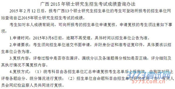 广西 2015 年硕士研究生招生考试成绩查询办法》。该办法明确说明,2月12日,广西省13个研招单位将统一公布2015考研初试成绩。考生届时可到各自报考院校官网查询成绩。