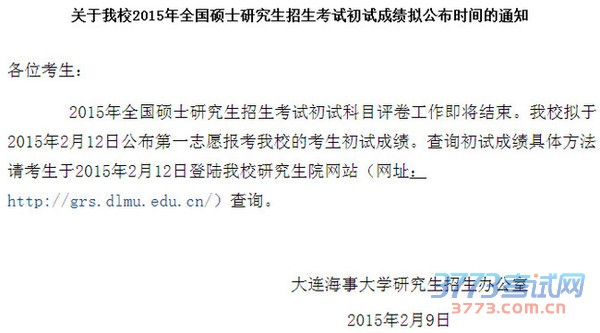 大连海事大学研究生院发布《关于我校2015年全国硕士研究生招生考试初试成绩拟公布时间的通知》。该校拟定于212日公布2015考研初试成绩。届时,考生可登录高校研究生院官网查看考试成绩。
