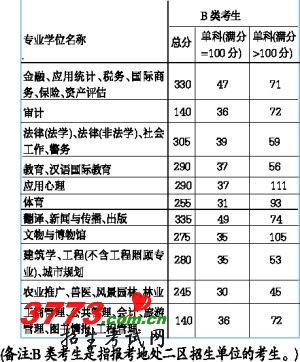我省所在的二区学术型研究生复试分数线,文学最高,为335分;经济学、管理学均为330分。除经济学、法学、文学、历史学、工学(不含照顾专业)、管理学、军事学等7个学科复试分数线与去年一样外,哲学、教育学(不含体育学)、力学、农学、医学(不含中医类照顾专业)、体育学、艺术学、中医学、工学照顾专业等9个学科复试分数线均比去年提升5分。专业学位复试分数线中,翻译、新闻与传播、出版专业最高,为335分,工商管理、公共管理、会计、旅游管理、图书情报、工程管理、审计硕士最低,为140分。与去年专业学位复试分数线相比,金融、应用统计、税务、国际商务、保险、资产评估硕士等与去年持平,教育、汉语国际教育硕士,应用心理硕士等较去年提升5分。