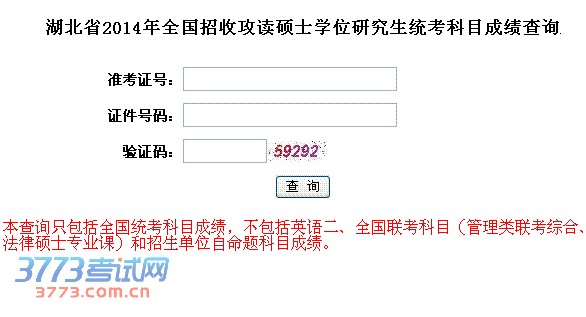 湖北省2014年全国招收攻读硕士学位研究生统考科目成绩查询准考证号:证件号码:验证码: 本查询只包括全国统考科目成绩,不包括英语二、全国联考科目(管理类联考综合、法律硕士专业课)和招生单位自命题科目成绩。