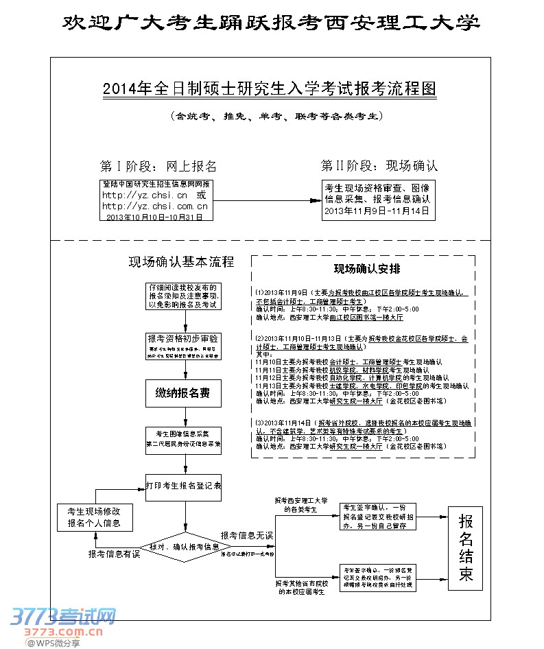 根据教育部、陕西省对全日制硕士研究生报名、考试的安排,2014年全国硕士研究生(含统考、推免、单考、联考等各类考生)入学考试报名分为两个阶段: