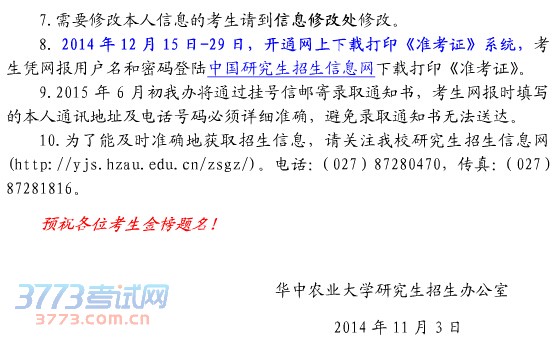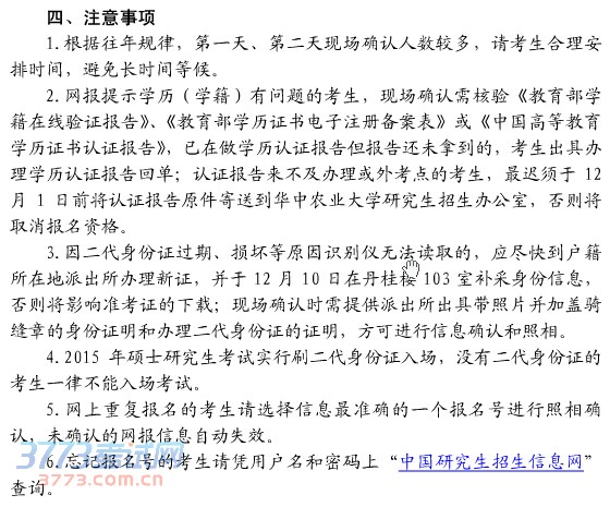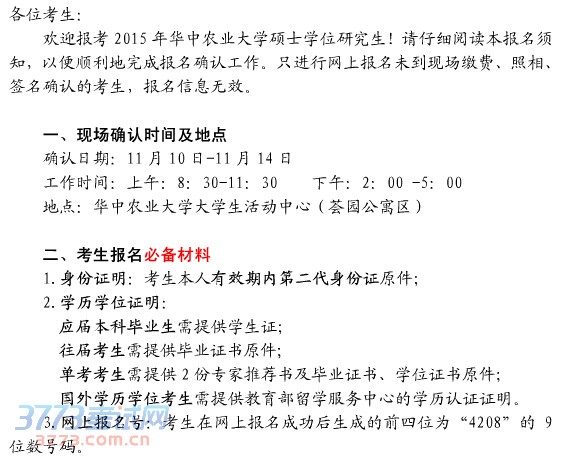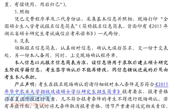 华中农业大学2015年考研现场确认公告