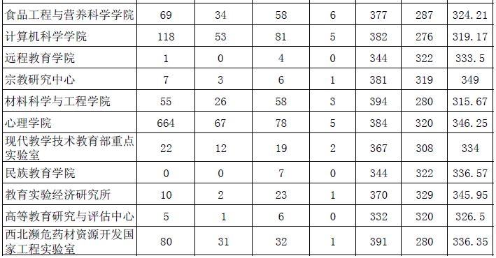 注:1.最高分、最低分及平均分不包含推免生、公共管理硕士MPA、工商管理硕士MBA和旅游管理硕士MTA。 2.此表不含少数民族骨干计划考生、单独考试考生。