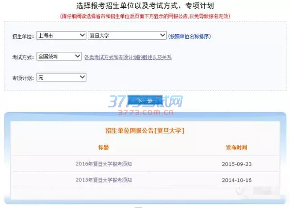 注:在选择报考单位之后,下方会自动显示招生单位网报公告,如图中复旦大学,勤思考研建议研友们一定要先阅读下招生单位的报考须知。