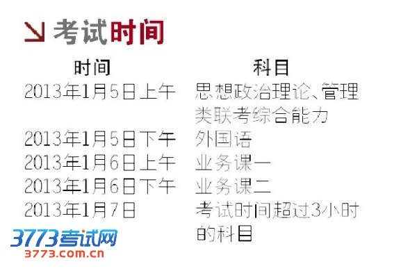 另外,2013年考研初试时间定在2013年1月5日至6日(超过3小时的考试科目在1月7日进行)。具体时间为:上午8:30-11:30,下午14:00-17:00。1月7日的考试,起始时间为8:30,但最长截止时间不得超过14:30。每科考试时间一般为3小时,建筑设计等特殊科目考试时间最长不超过6小时。初试方式均为笔试。