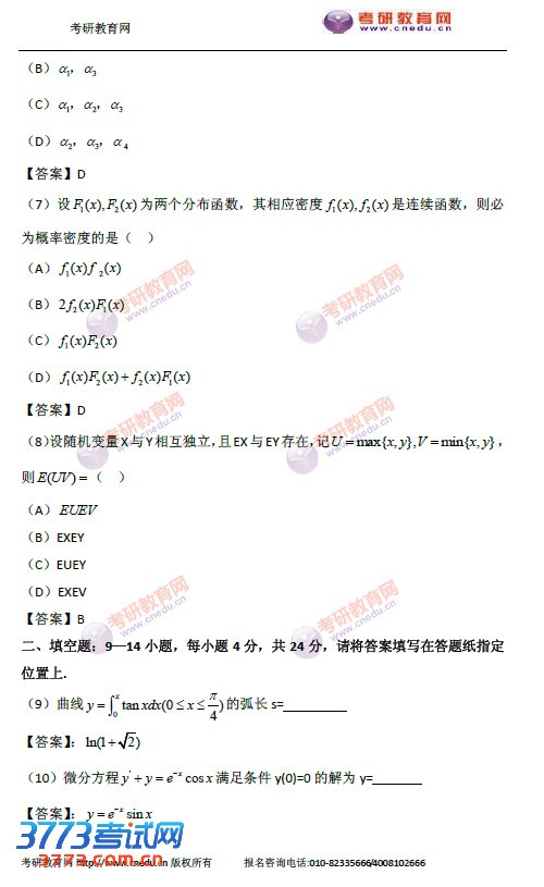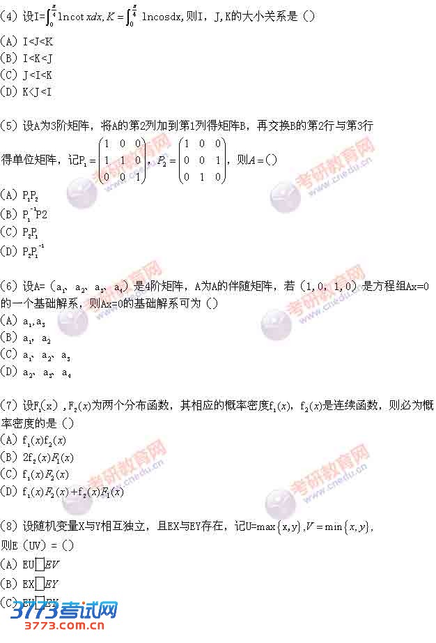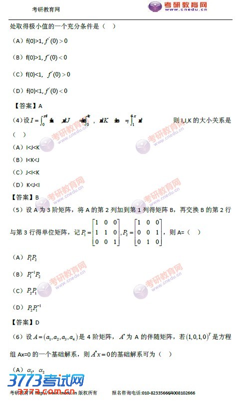 2016考研数学三试题及答案:选择题