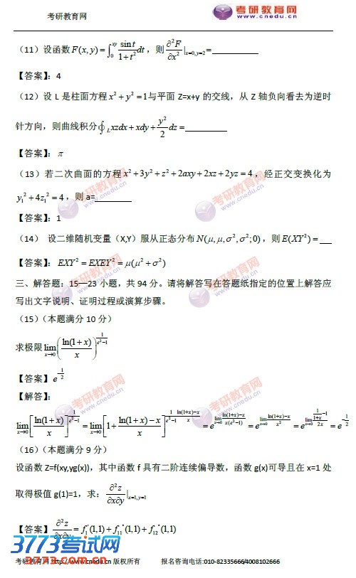 2015考研数学二答案完整版发布