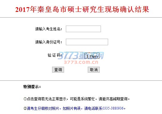 2017年秦皇岛市硕士研究生现场确认结果 请输入考生姓名: 请输入身份证号: 验 证 码: 特别提示: ①点击查询若无法正常显示,可能是系统繁忙,请避开高峰期查询。
