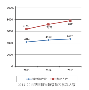 Reflected in the chart given above are the respective changes in the numbers of museums and their visitors in China from the year 2013 to 2015。 It can be clearly seen that the number of museums was on a continuous rise from 6378 to 7811 in the two years, up more than 22%, and so did that of the visitors, with an increase of nearly 13% from 4165 to 4692。