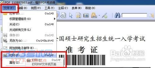 第六步:准考证下载完毕后,到附近的打印店,建议用pdf阅读器打开,否则比较容易出现文字缺失的情况。打开后,点击文件打印。