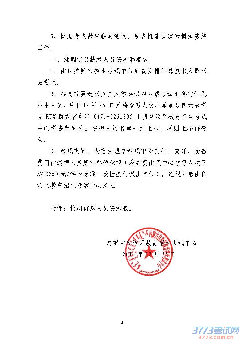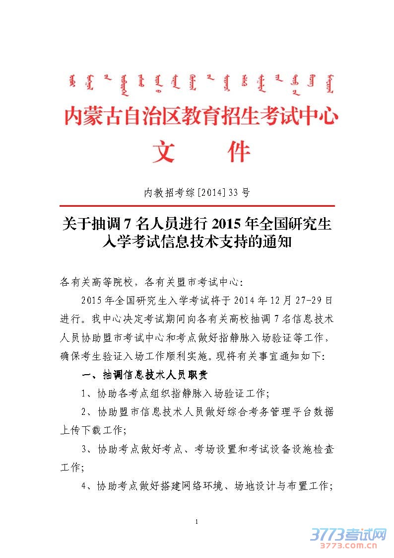 关于抽调7名人员进行2015内蒙古考研信息技术支持的通知