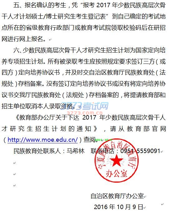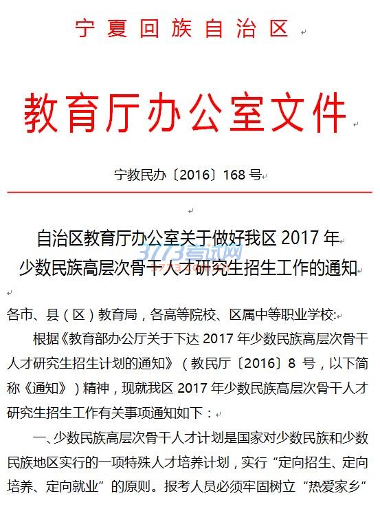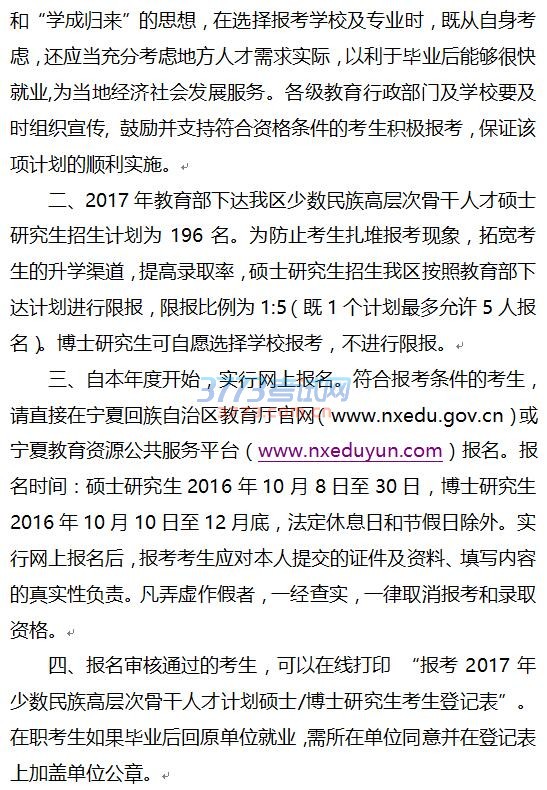 2017宁夏少数民族高层次骨干人才研究生招生通知
