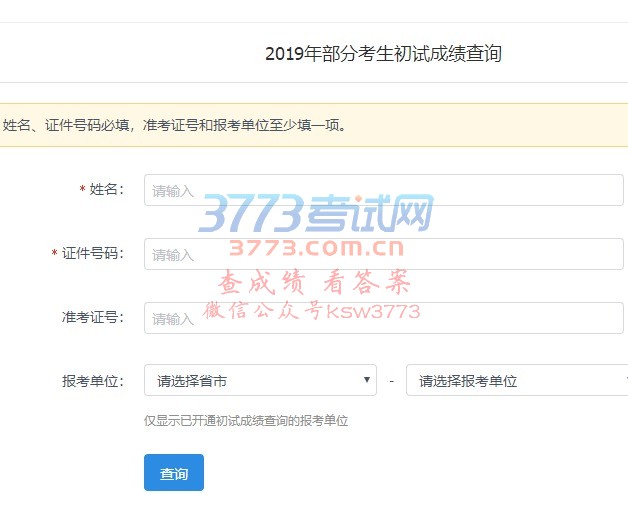 姓名、证件号码必填,准考证号和报考单位至少填一项。